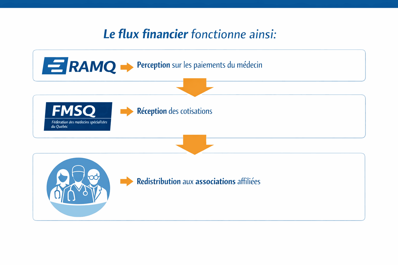 Chaque médecin spécialiste au Québec paie une cotisation annuelle à la Fédération des médecins spécialistes du Québec (FMSQ) ainsi qu’à son association affiliée. Comme ces montants sont prélevés directement par la Régie de l’assurance maladie du Québec (RAMQ), plusieurs médecins se demandent comment ils sont déterminés et comment ils sont perçus.
